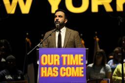 米ニューヨークの集会で演説する市長選候補のゾーラン・マムダニ氏=13日(ゲッティ=共同)