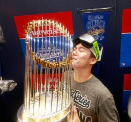 ワールドシリーズ2連覇を果たし、シャンパンファイトでトロフィーと記念撮影するドジャース・山本=トロント(代表撮影・共同)