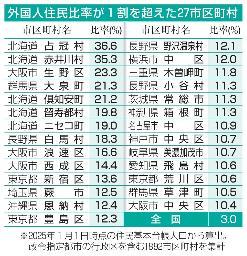 ◎外国人1割超、27市区町村に 全国35万人増、地場産業担い手