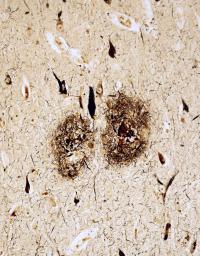 脳の中にたまった「アミロイドベータ」(中央の二つのだ円形部分)(東京大薬学部提供)