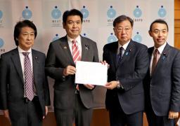 自民党の「大学病院を支援する議員連盟」の松野博一会長(中央右)から緊急決議を受け取る松本文科相=11日午後、文科省
