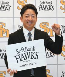 ソフトバンクの中学生硬式野球チームの初代監督に就任し、ポーズをとる嘉弥真氏=13日、みずほペイペイドーム