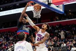 セブンティシクサーズ戦でダンクシュートを決めるピストンズのグリーン(左)=14日、デトロイト(AP=共同)
