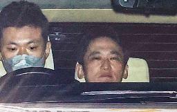 移送のため警視庁本部を出る松原全宏容疑者(右)=19日午後10時39分
