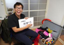 大道芸の道具が入った箱を開き笑顔の松本拓也さん=4日、静岡市