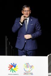 「東京デフリンピック」の閉会式であいさつする国際ろう者スポーツ委員会のアダム・コーサ会長=26日、東京体育館