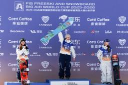 スノーボードW杯のビッグエア開幕戦の女子で表彰台を独占した日本勢。(左から)2位岩渕麗楽、優勝した深田茉莉、3位鬼塚雅=張家口(ゲッティ=共同)
