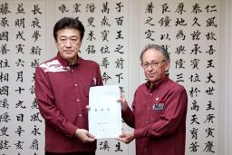 沖縄県の玉城デニー知事(右)から要望書を受け取る木原官房長官=30日午後、沖縄県庁