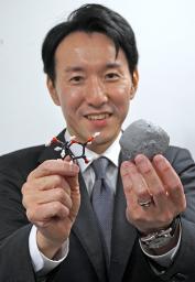 小惑星ベンヌ(右)とリボースの模型を手にする東北大の古川善博准教授=1日、東京都千代田区