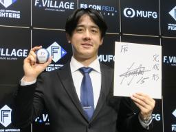 契約交渉を終え、色紙を手にポーズをとる日本ハム・北山=4日、エスコンフィールド