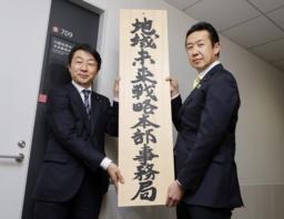 「地域未来戦略本部事務局」の看板をかける黄川田地方創生相(右)ら=4日午後、東京・永田町