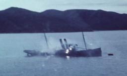 1945年7月31日、長崎県・大村湾で米軍機の機銃掃射を受ける輸送船(豊の国宇佐市塾提供)