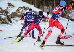 W杯複合男子個人第4戦の後半距離で力走する谷地宙(中央)=トロンヘイム(共同)