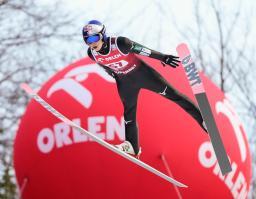 W杯ジャンプ男子個人第7戦で2位に入った小林陵侑の1回目の飛躍=ビスワ(共同)