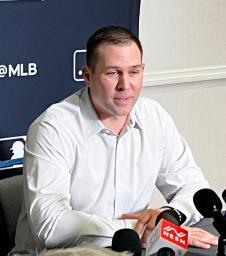 取材に応じるパドレスのスタメン監督=8日、オーランド(共同)