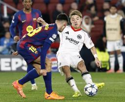 バルセロナ戦でゴールを狙うEフランクフルトの堂安(右)=バルセロナ(共同)