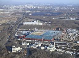 次世代半導体の国産化を目指すラピダスの工場(手前)。左奥は北海道千歳市の市街地=3月