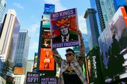 米ニューヨークの観光名所タイムズスクエアで、「王はいらない」と書かれたプラカードを掲げるデモ参加者=18日(共同)