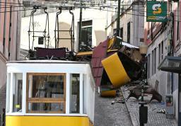 9月、脱線し大破したケーブルカーの車体(奥)=ポルトガル・リスボン(共同)