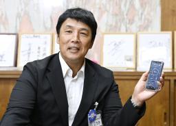 自身のスマートフォンを手に、インタビューに答える愛知県豊明市の小浮正典市長=9月、豊明市役所