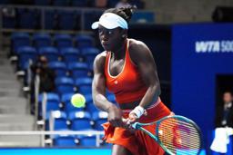 東レ・パンパシフィック・オープン、2回戦でプレーするビクトリア・エムボコ=22日、東京・有明テニスの森公園(ゲッティ=共同)