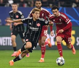 リバプール戦で攻め込むEフランクフルトの堂安(左)=フランクフルト(共同)