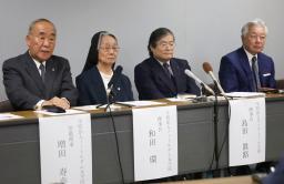 記者会見するノートルダム女学院、ヴィアトール学園両学校法人の関係者=23日午後、京都市上京区