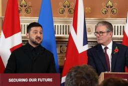 ウクライナ支援の有志国連合会合後、記者会見するゼレンスキー大統領(左)とスターマー英首相=24日、ロンドン(共同)