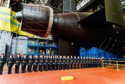 1日、ロシア北部セベロドビンスクで行われた原子力潜水艦「ハバロフスク」の進水式(画像の一部が加工されています、ロシア国防省提供・タス=共同)