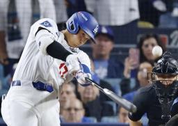 指名打者で出場したワールドシリーズ第3戦、この試合2本塁打目となる同点ソロを放つドジャース・大谷=ロサンゼルス(共同)