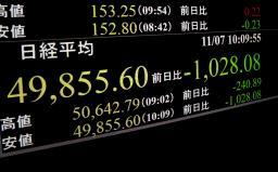 下げ幅が一時1000円を超えた日経平均株価を示すモニター=7日午前、東京・東新橋