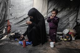 6日、ガザ中部デールバラハのテントで避難生活を送る女性と子ども(ゲッティ=共同)