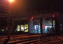 クマが入り込み、捕獲されたJR新庄駅の車庫=8日午後6時30分ごろ、山形県新庄市