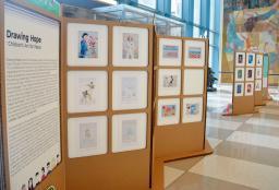 北朝鮮や日本の子どもたちが描いた絵の展示会=10日、米ニューヨークの国連本部(共同)