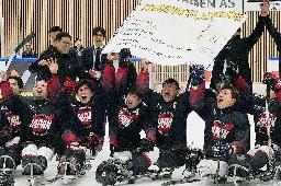 2大会ぶりの冬季パラ出場を決めて喜ぶ、パラアイスホッケーの日本チーム=イエスヘイム(MA SPORTS提供)