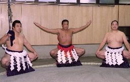 2001年、赤い横綱を締め還暦土俵入りの練習をする元横綱の北の富士さん(中央)。左は九重親方(元横綱千代の富士)、右は八角親方(元横綱北勝海)=東京都墨田区の八角部屋