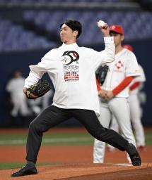 ◎残留の近本が社会人野球で始球式 球場内から「ありがとう」