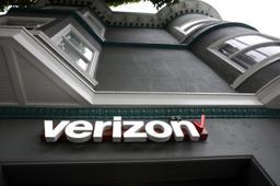 ベライゾン・コミュニケーションズの店舗に表示されたロゴ=13日、米サンフランシスコ(ゲッティ=共同)