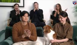 米大リーグ、ナショナル・リーグのMVPに満票で選ばれ、MLBネットワークの番組で喜ぶドジャースの大谷翔平。右は妻真美子さん=13日