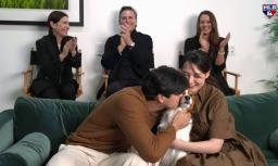 米大リーグ、ナショナル・リーグのMVPに満票で選ばれ、MLBネットワークの番組で喜ぶドジャースの大谷翔平(手前左)と妻真美子さん=13日