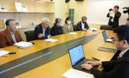 長崎原爆資料館の南京事件の展示を巡り、同館に申し入れをする団体のメンバーら(左側)=14日午前、長崎市