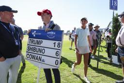 アニカ・ゲインブリッジ・ペリカン第2ラウンド、18番を終えたアマチュアのカイ・トランプ=14日、フロリダ州ベレア(イマジンイメージズ・ロイター=共同)