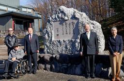 「富良野演劇工場」に寄贈した石碑の前で記念撮影する倉本聰さん(左端手前)=16日午前、北海道富良野市
