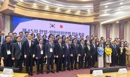 日韓議員連盟と韓日議員連盟の合同総会の開会式で記念撮影する参加者ら=16日、ソウル(共同)