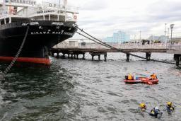 女性とみられる上半身だけの遺体が発見された「氷川丸」付近の海中を捜索する神奈川県警のダイバーら=18日午前、横浜市