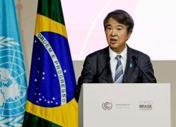 COP30の閣僚級会合で演説する石原環境相=18日、ブラジル・ベレン(共同)