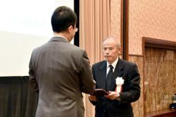 「地域貢献大賞」の表彰式で日本新聞協会の中村史郎会長(左)から大賞の記念の盾を受け取る北國新聞宝立販売所の船本寛所長=20日午後、東京都千代田区