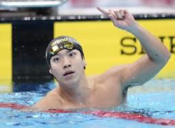 男子200メートル自由形決勝 1位でゴールし、ポーズをとる茨隆太郎=東京アクアティクスセンター