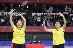 女子ダブルスで優勝し、観客に笑顔で手を振る矢ケ部紋可(右)と真衣=武蔵野の森総合スポーツプラザ
