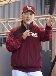 ファン感謝祭に参加し、ステージで話す楽天・則本=22日、楽天モバイルパーク宮城